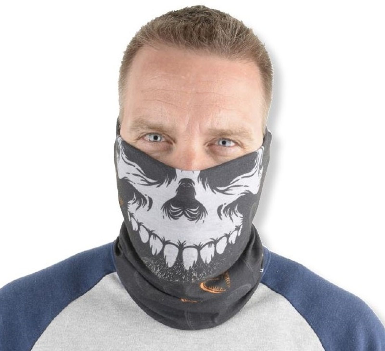 Multifunkční pokrývka hlavy ve stylovém designu lebky, která může sloužit jako čepice, šátek, čelenka a maska.