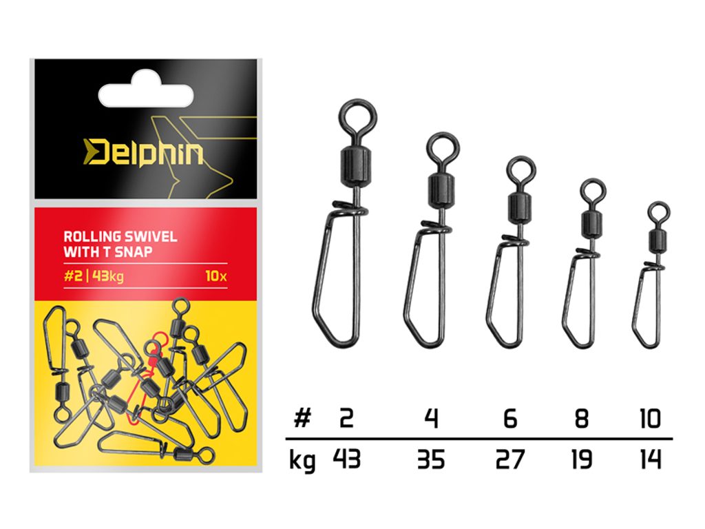 Karabinka s obratlíkem Delphin Rolling swivel with T snap je komponent koncové montáže pro rychlou výměnu přívlačových nástrah nebo zátěží, přičemž jeho použití eliminuje kroucení vlasce při navíjení.