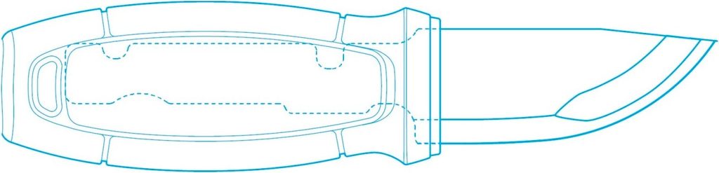 - V horní části rukojeti se nalézá závěsný otvor pro uchycení nože pomocí karabiny, provázku nebo paracordu podle druhu využití.