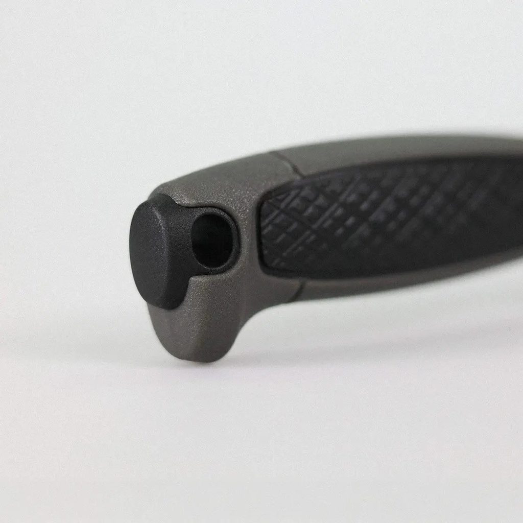- V horní části rukojeti se nalézá závěsný otvor pro uchycení nože pomocí karabiny, provázku nebo paracordu podle druhu využití.