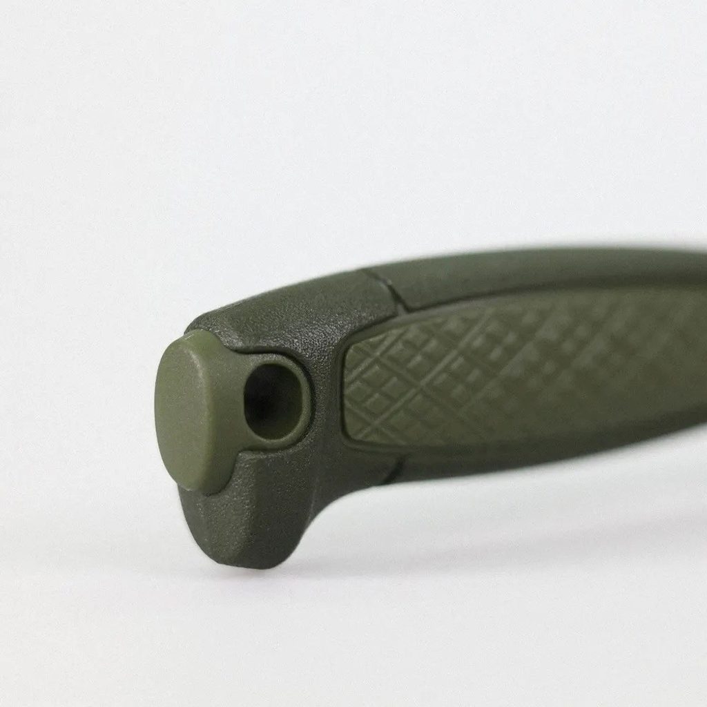 - V horní části rukojeti se nalézá závěsný otvor pro uchycení nože pomocí karabiny, provázku nebo paracordu podle druhu využití.