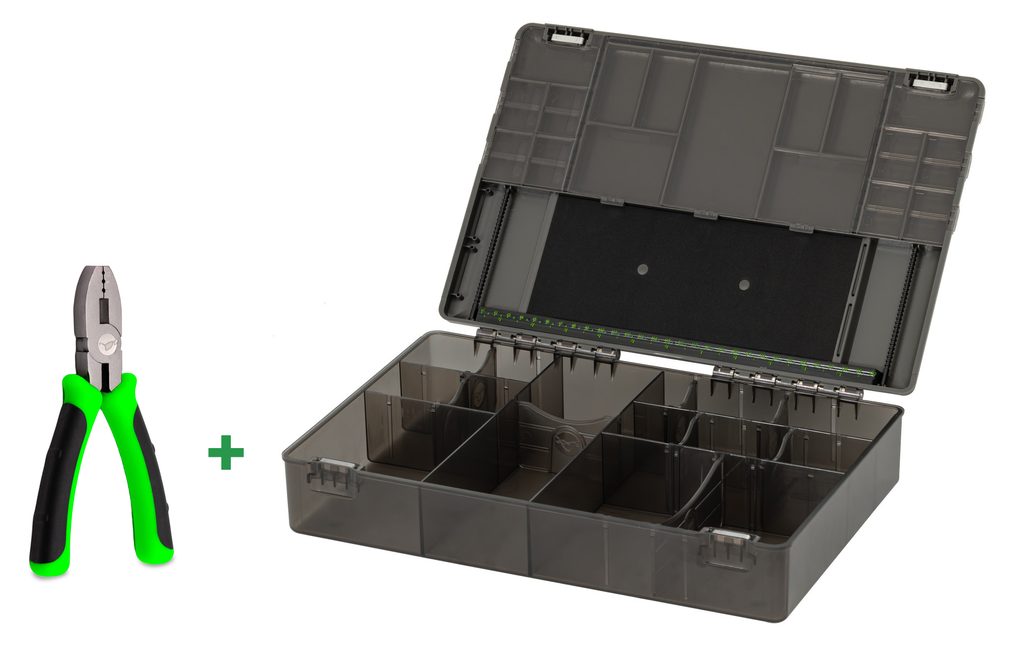 Jednoduše posuňte příčky a navrhněte si ideální organizační uspořádání; obsahuje všestrannou sadu odnímatelných přepážek – 6 malých, 1 střední a 2 velké – což vám umožňuje donekonečna přestavovat úložný prostor tak, aby vyhovoval vašim měnícím se požadavkům.Trvalé stěny v boxu na náčiní jsou rozmístěny tak perfektně, aby se do nich vešly naše návazcové šňůrky, Sady krabiček, Bait Floss, Leadcore, Arma Kord, Leader Safe pouzdro a krabičky Kamakura háčků spolu s dalšími předměty, jako jsou nůžky a jehly.