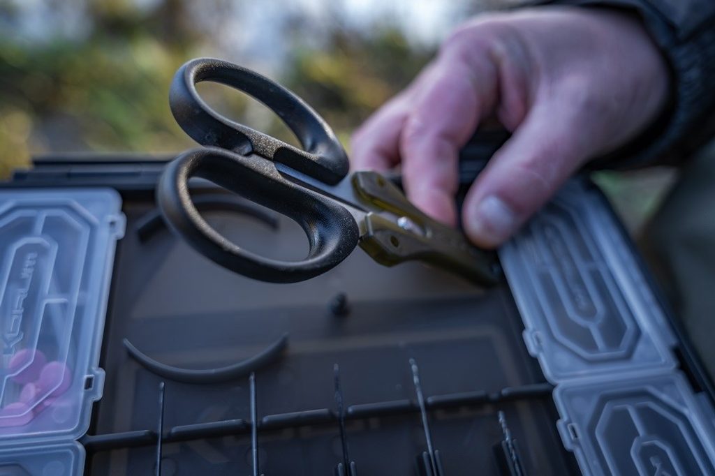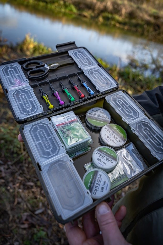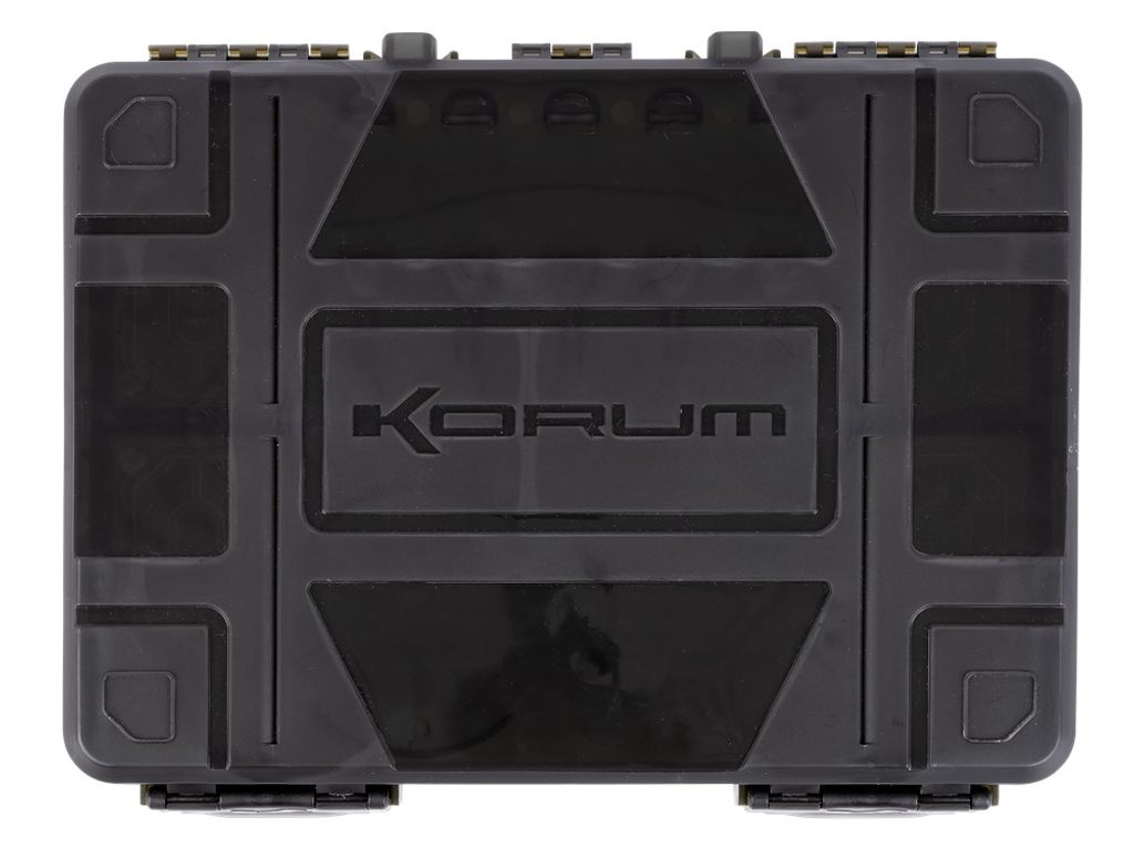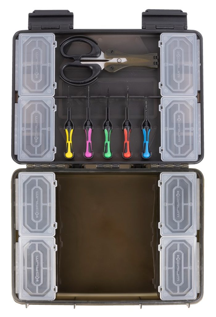 Korum Slim Blox Fully Loaded, ještě kompaktnější edice oblíbené plně nabité krabičky Korum. Silná odolná krabička na náčiní s těsněním kolem vnějšího víka. S osmi přihrádkami na příslušenství uzavíratelnými na klip a centrálním prostorem pro stavbu návazců. Dodávají se se sadou nůžek Korum a pěti nástroji na nástrahy TI, které se všechny připínají pod víko.