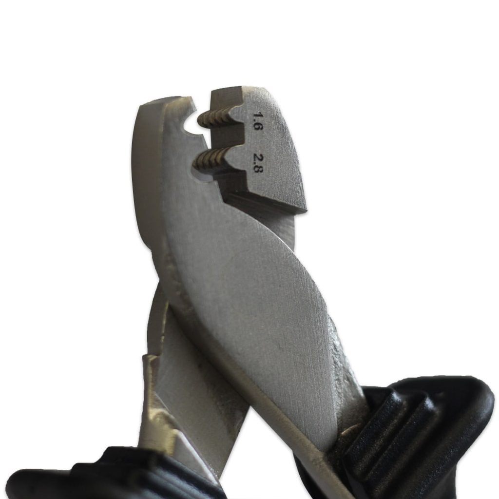 Širší čelisti snadno stlačí krimpovací kovové spojky a tím zajistí pevnou smyčku vašeho návazce.Označení na čelisti, které jsou určeny na dva průměry spojek 1,6 nebo 2,8mm.