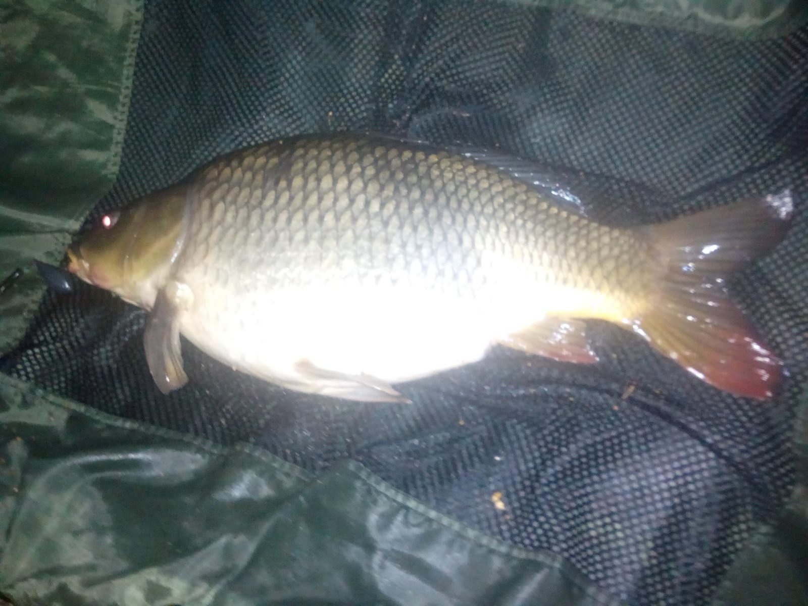 Víťu už vidím na kraji zátoky a jedu pro něj na pramici na druhý břeh. Mezitím jsem vymyslel strategii na další lov, kam umístit 4 pruty. Rozhodl jsem se, že jeden prut zavezu na kraj zátoky, kdyby ryby migrovaly ze zátoky na volnou vodu. Dva pruty jsme zavezly na kraje krmného místa a jeden na začátek zátoky asi 20 metrů od krmného místa. Všechny montáže jsou na místě a jedu opět zakrmit kukuřicí s řepkou. Obloha nevěstí nic dobrého.Vypadá to, že přijde bouřka. V 19.00 přichází záběr na můj pravý prut. Za chvíli mi Víťa podebírá kapra šupináče 65 cm. Zase na G2 s pampeliškou z krmného místa. Kapra vyfotím a pouštím zpátky do vody. Neuběhne ani půl hodiny a Víťa má záběr na pravý prut z počátku zátoky. Vypadá to na větší rybu. Asi po dvaceti minutách je kapr konečně na břehu.Na podložce zjišťujeme míru a váhu.Je to nádherný lysec 77 cm a 8,5 kg.Po zdokumentování kapr putuje do vodní říše. Zachutnala mu jedna kulička 16 mm Kořeněná játra od Mikbaits. V noci přichází očekávaná bouřka. V noci se nic neděje až v 5.30 mám záběr zase na G2 s pampeliškou. Je to kapr 55 cm a už je zpátky ve vodě. Kolem poledne končíme a balíme věci. Krásně jsme si to užili a brzy se sem zase vrátíme.
