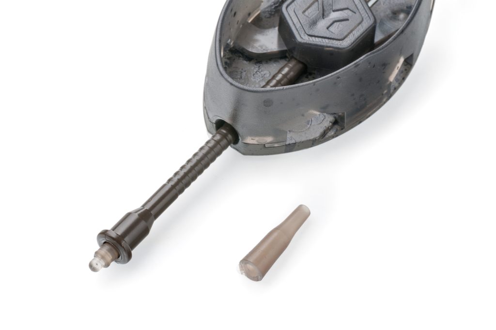 Tělo krmítka je precizně odlito z odolného plastu v kouřově olivovém zabarvení. Zátěže na spodní straně krmítka jsou v maskovacím designu. Tvar krmítka je navržen pro použití s hrubšími návnadami a mikropeletami. Zvýšená přední část spolehlivě drží návnadu i při lovu na extrémně dlouhé vzdálenosti. Krmítko se dodává s adaptérem pro rychlou výměnu připojeného návazce a převlekem proti zamotání.