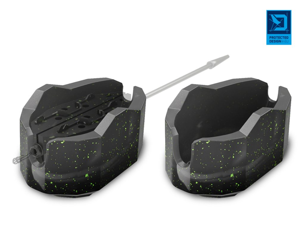 Tvar formy je uzpůsoben pro rychlou manipulaci a co nejjednodušší odnětí z krmítka. K hladké manipulaci přispívají dva výrazné boční výstupky a speciálně profilovaná spodní strana s drážkami a logem Delphin. Tyto prvky přesně znázorňují ideální místo stlačení, čímž se předchází nechtěnému rozpadu krmné směsi při vyklápění. Celkový tvar a velikost formy jsou navrženy tak, aby bezvadně pasovaly na model krmítka Delphin Method QUIX XL, ale díky univerzálnímu provedení ji bez problémů využijete i při ostatních běžně dostupných method feederových krmítkách v dané velikosti.