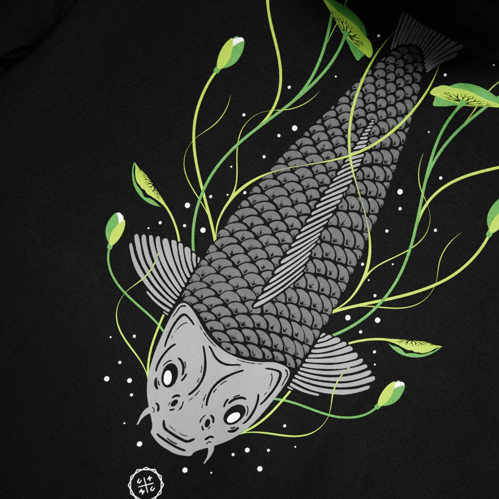 Když jste po nás volali, abychom vám vyrobili naši grafiku „Tails Up“ v podobě mikiny s kapucí, my jsme ji dodali. Ručně kreslená, u nás, od základu; naše grafika Tails Up zobrazuje kapra, který se živí mezi lekníny a vysílá oblaka bublin... něco, co dostane srdce každého závodícího rybáře. 5barevný sítotisk s tlumenými šedými odstíny a kontrastní zelenou na naší super měkké látce o gramáži 320 g/m2 s kontrastními konci šňůrek a tkanými detaily na boční straně.