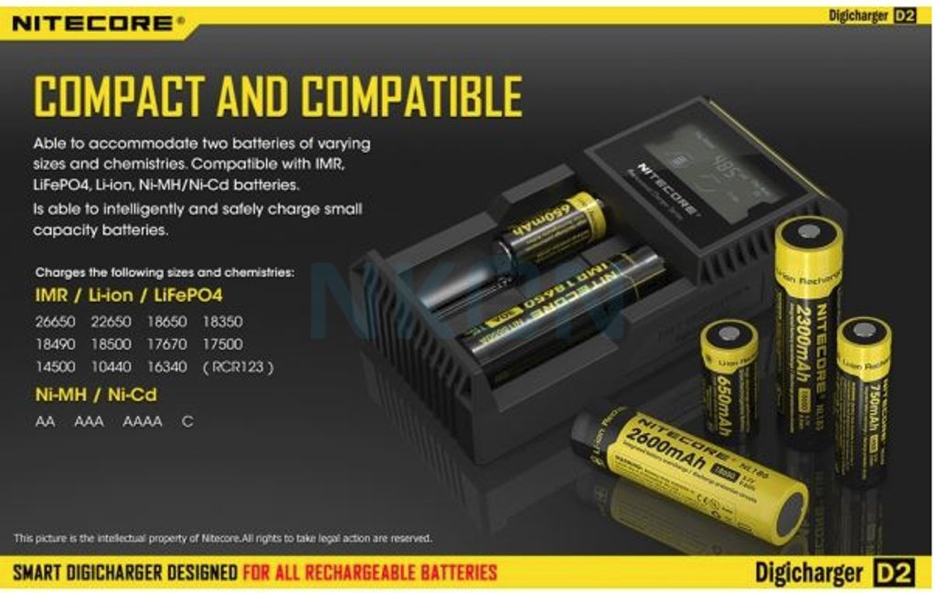 • IMR / Li-Ion / LiFePO4: 10440, 14500, 16340 (RCR123), 17500, 17670, 18350, 18490, 18650, 22650, 26650