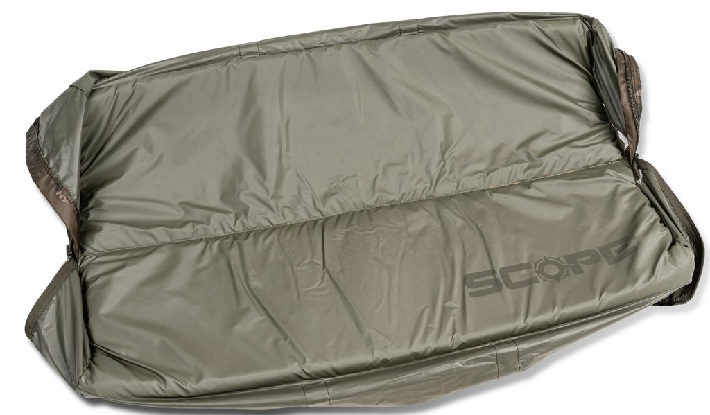 Rozšířené boční zipy mají několik funkcí – podložku lze použít zcela rozloženou, částečně zapnutou pro vytvoření bočních stěn, nebo úplně zapnutou, kdy slouží k bezpečnému přenosu ryby zpět k vodě. Zároveň umožňují pohodlné přenášení prutů Scope, podběráků, hlásičů či oblečení při krátkých vycházkách nebo stalkingu. Zipy zabraňují nechtěnému otevření a zajišťují bezpečné uložení ryby nebo výbavy.Podložka je silně polstrovaná 40mm pěnou s vysokou hustotou a potažena jemným, voděodolným materiálem s vodním sloupcem 5000 mm. Díky tomu plave při focení ve vodě a přitom zůstává dostatečně lehká, aby mohla sloužit také jako vážicí sak.
