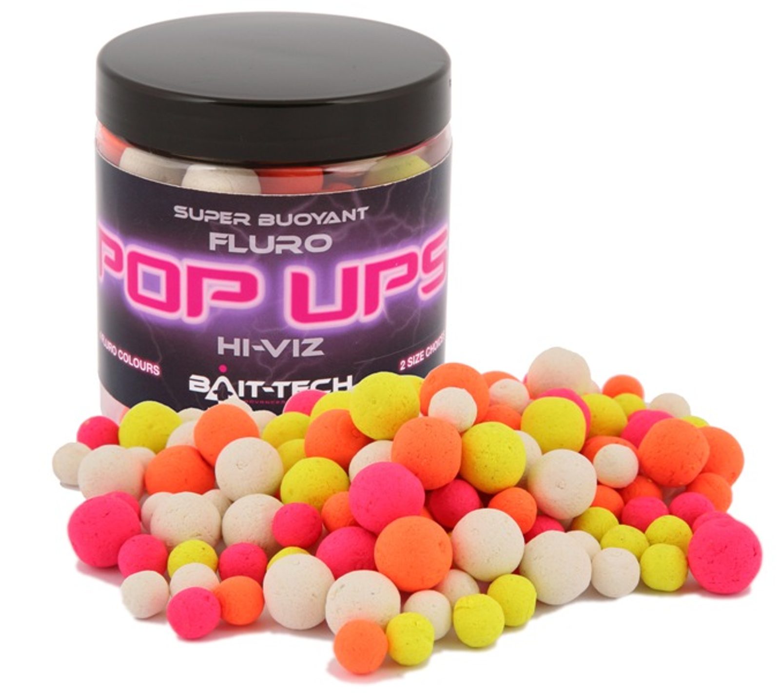 Skvěle viditelné, vizuálně přitažlivé s pronikavou příchutí. Bait-Tech Hi-Viz Fluro pop-up boilies jsou, vyrobeny aby byly super-úspěšné. Tyto pop-up boilies rybu vizuálně stimulují a přimějí k okamžitému záběru.