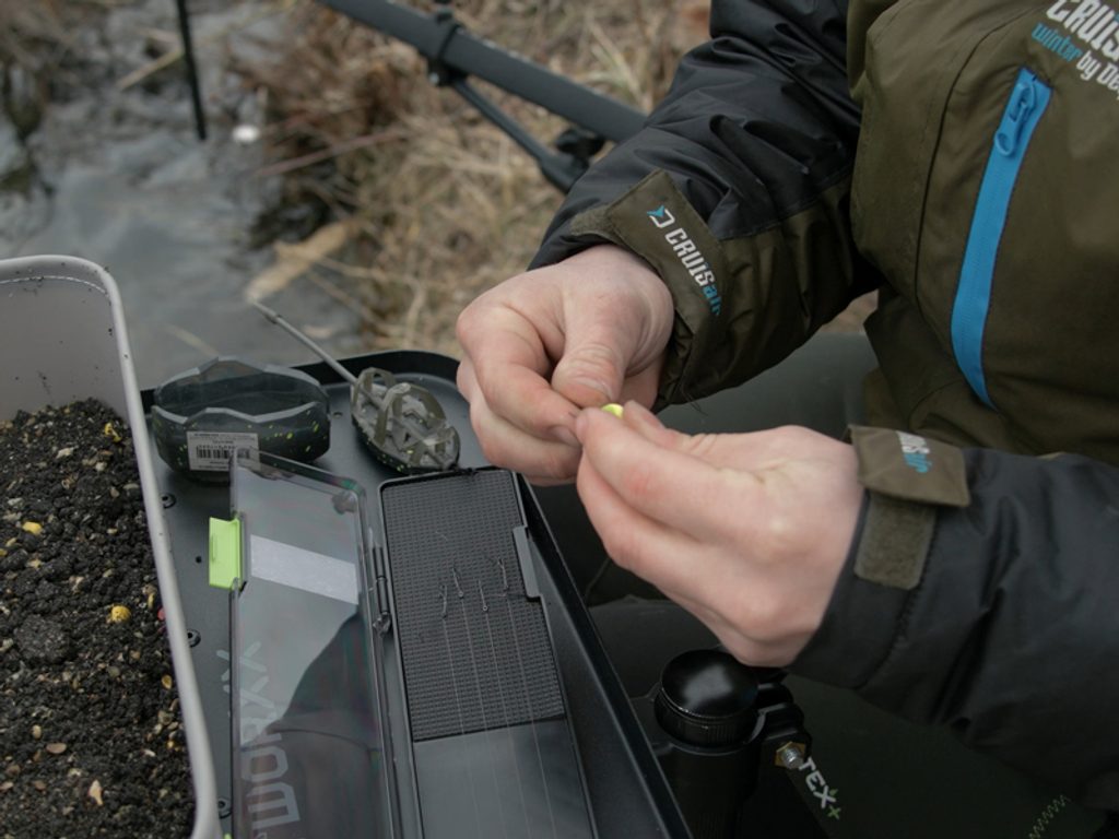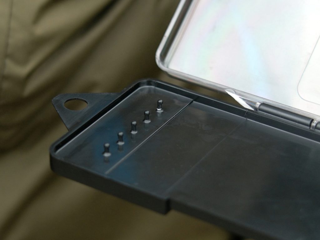 Tělo boxu je vyrobeno z odolného černého plastu, který chrání obsah před mechanickým poškozením. Vnitřek je vybaven plastovými výběžky pro přesné uchycení smyček a měkkou EVA pěnou, do které spolehlivě zapíchnete háčky bez rizika otupení jejich hrotů. Díky délce 303 mm je tento box ideální na různé návazce používané při lovu na klasický feeder či method feeder.