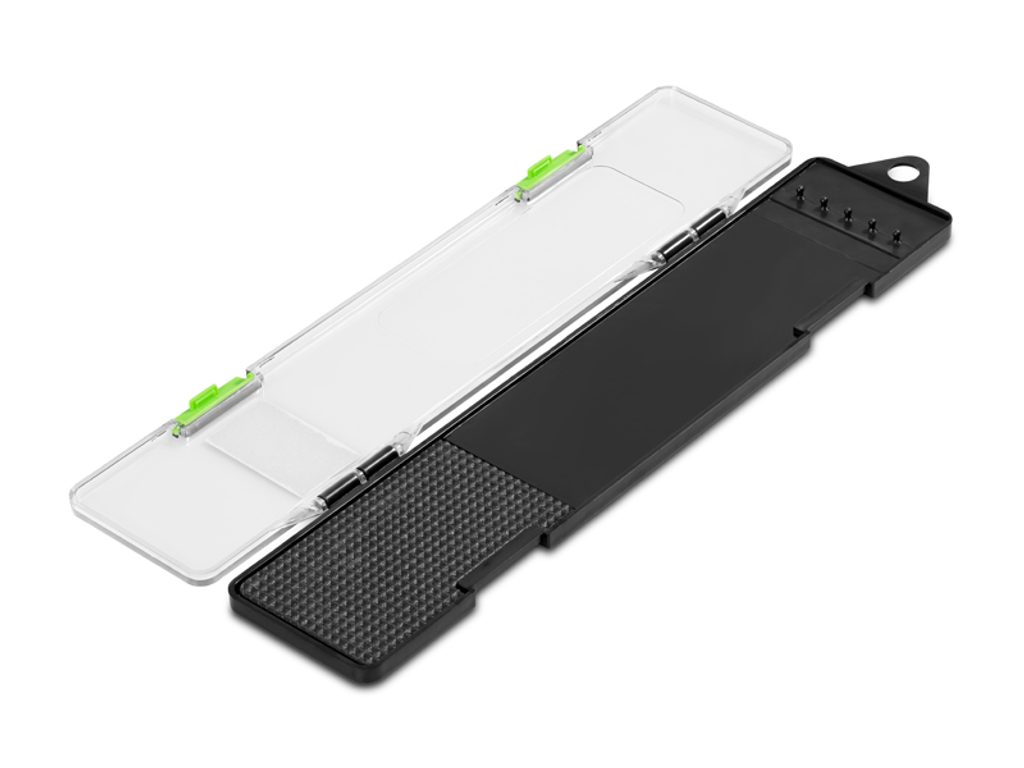 Tělo boxu je vyrobeno z odolného černého plastu, který chrání obsah před mechanickým poškozením. Vnitřek je vybaven plastovými výběžky pro přesné uchycení smyček a měkkou EVA pěnou, do které spolehlivě zapíchnete háčky bez rizika otupení jejich hrotů. Díky délce 216 mm je tento box ideální zejména na kratší návazce používané při lovu technikou method feeder.