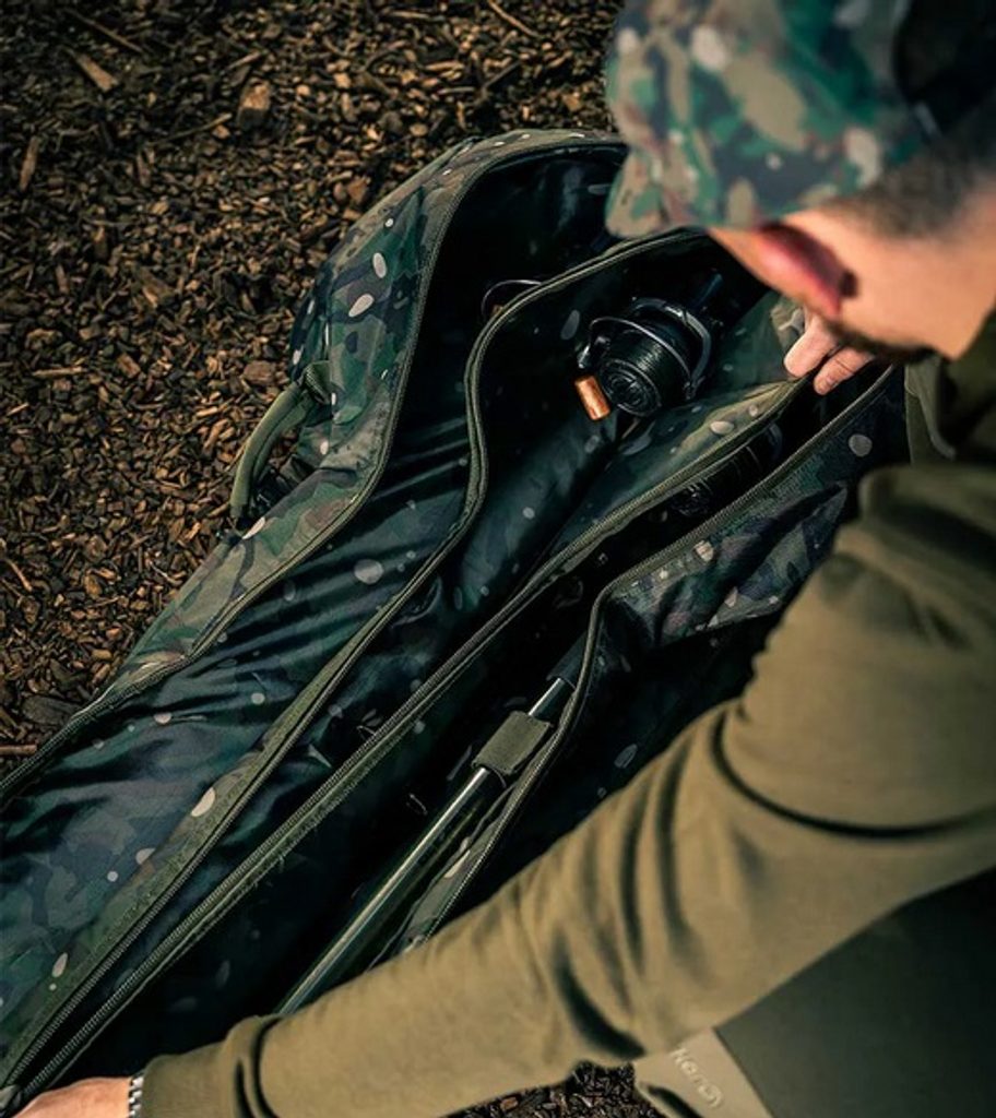 K dispozici je i další popruh a elastická smyčka, kterou lze použít pro uložení kobry, takže i ona může těžit z polstrované ochrany. Nadrozměrná část pouzdra na naviják je silně polstrovaná a velkoryse dimenzovaná, aby ochránila i ty největší navijáky. Obě strany pouzdra NXC 3 Rod Sleeves mají velké vnější kapsy na zip, které jsou vhodné pro podběráky, vidličky a další příslušenství. Na zadní straně je na základně velká otevřená kapsa, kam můžete uložit další prut, který lze zajistit pomocí napínacích popruhů. Do další, menší otevřené kapsy na zip lze umístit podběrák nebo uložit distanční tyče. Hned pod hlavním zipem je úhledně umístěná kapsa na zip pro uložení olov.
