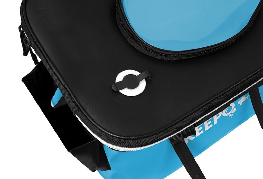 Delphin KEEPO je praktická EVA taška určená především na přechovávání živých nástražních rybek. Jeho vrchní část se otevírá po celém obvodu pomocí zipu. Víko je na vrchní části opatřeno otvorem, který je vyroben ze síťoviny, takže máte dokonalý přehled, co se uvnitř nachází. Otvor se uzavírá jednoduše zipem po jeho obvodu a slouží ke vkládání a vyjímání živé nástrahy. Najdeme zde i malý otvor pro hadičku okysličovače. Okysličování je možné uložit do vnější kapsy, která byla pro tento účel i primárně navržena (např. okysličovače Delphin A-PUMP maxi nebo mini). Taška je vybavena dvěma plastovými úchopy, které je možné zafixovat zasunutím jejich vrchních částí do sebe.