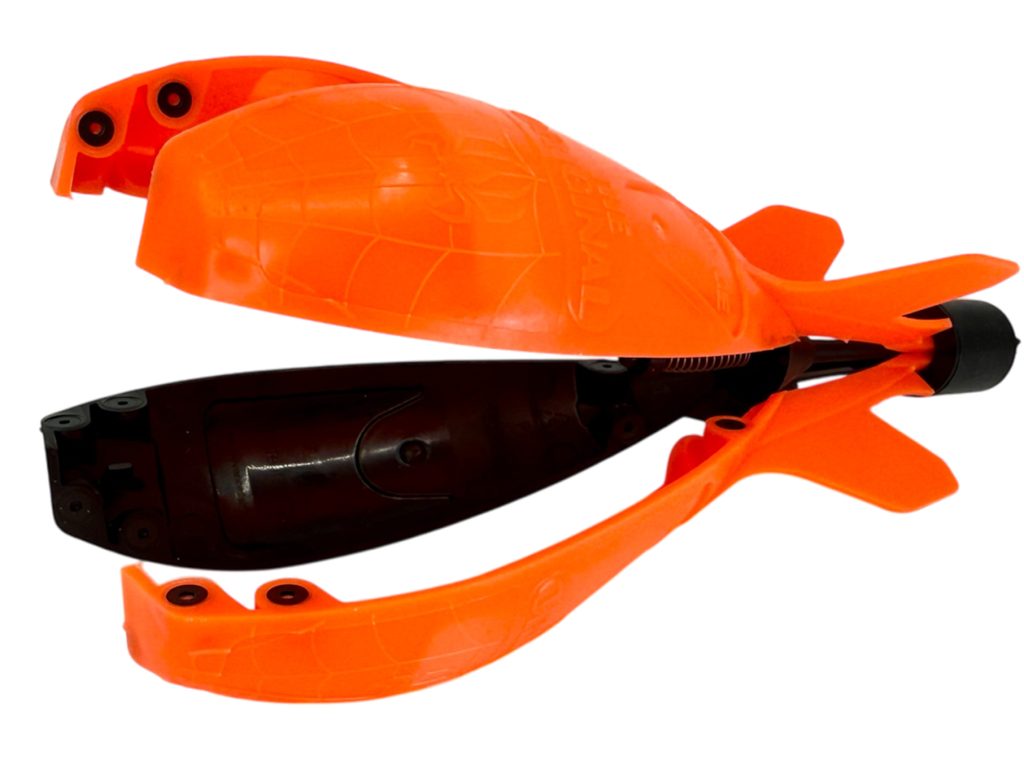 Patentovaný systém otevírání: Systém magnetů zaručuje bezproblémové otevření rakety po dopadu na hladinu a okamžité vysypání návnady.
