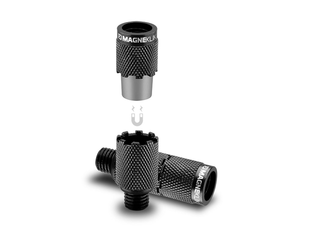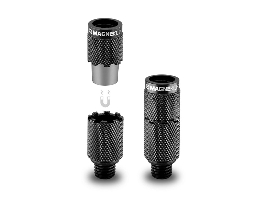MagneKLIK funguje na principu extra silného magnetu uvnitř a systému výstupků a zářezů, které do sebe univerzálně pasují. Signalizátor si natočíte do vrchní části a spodní uchytíte do stojanu/vidličky. Následně obě části spojíte zakliknutím magnetu a sestava je připravena k použití. Po rybaření část se signalizátorem jednoduše rozpojíte jedním tahem a signalizátor uschováte pro transport. Odpadá tak dlouhé šroubování signalizátoru před každým rybařením. S rychlospojkou MagneKLIK jste připraveni okamžitě začít lovit.