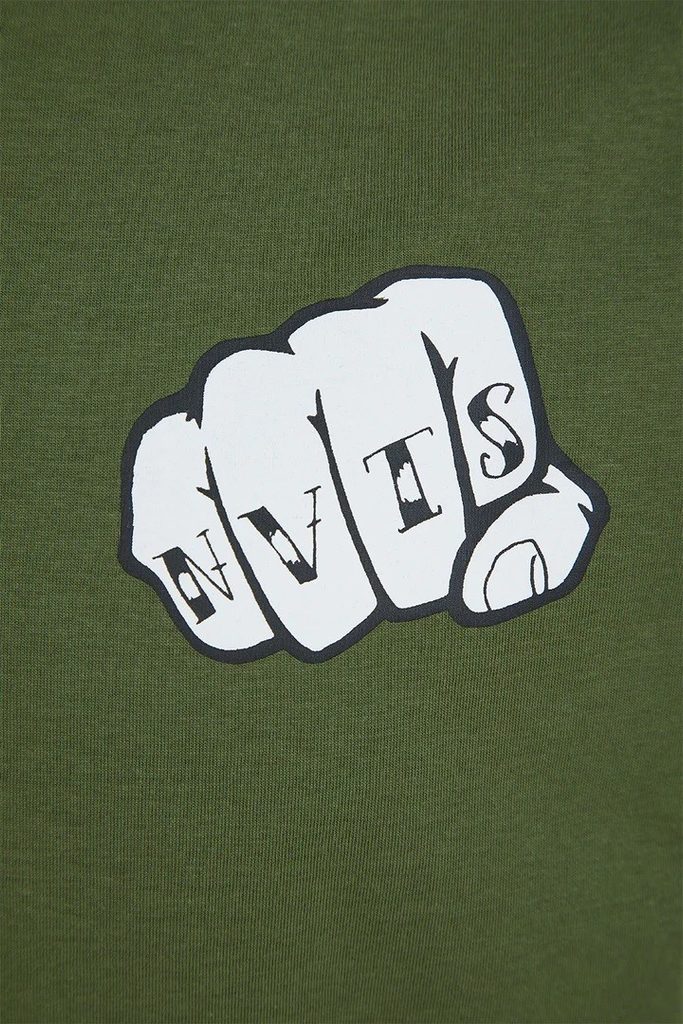 Zelené bavlněné tričko standardního střihu, s krátkými rukávy a kulatým výstřihem, s potiskem potetované pěsti na hrudi - Fist bump! jako způsob pozdravu či oslavné gesto.
