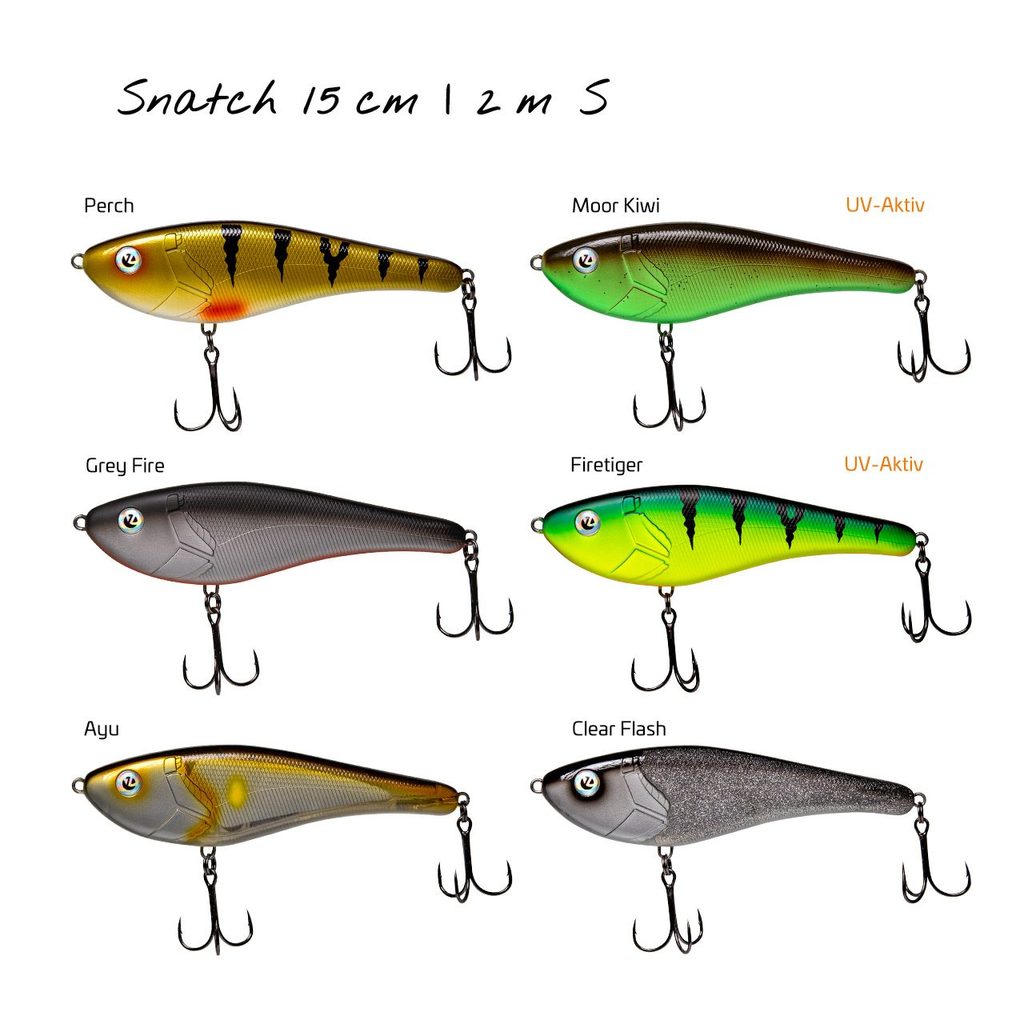 Speciální protizávaží zajišťuje, že Snatch velice čistě provádí změnu směru, klouže v dlouhých pruzích zleva doprava a vydává velmi tiché, tupé zvuky. Díky pomalému klesání jej můžete vést v různých vrstvách vodního sloupce. Díky jednodílné ose, procházející celou nástrahou, je Snatch obzvláště stabilní a robusní.